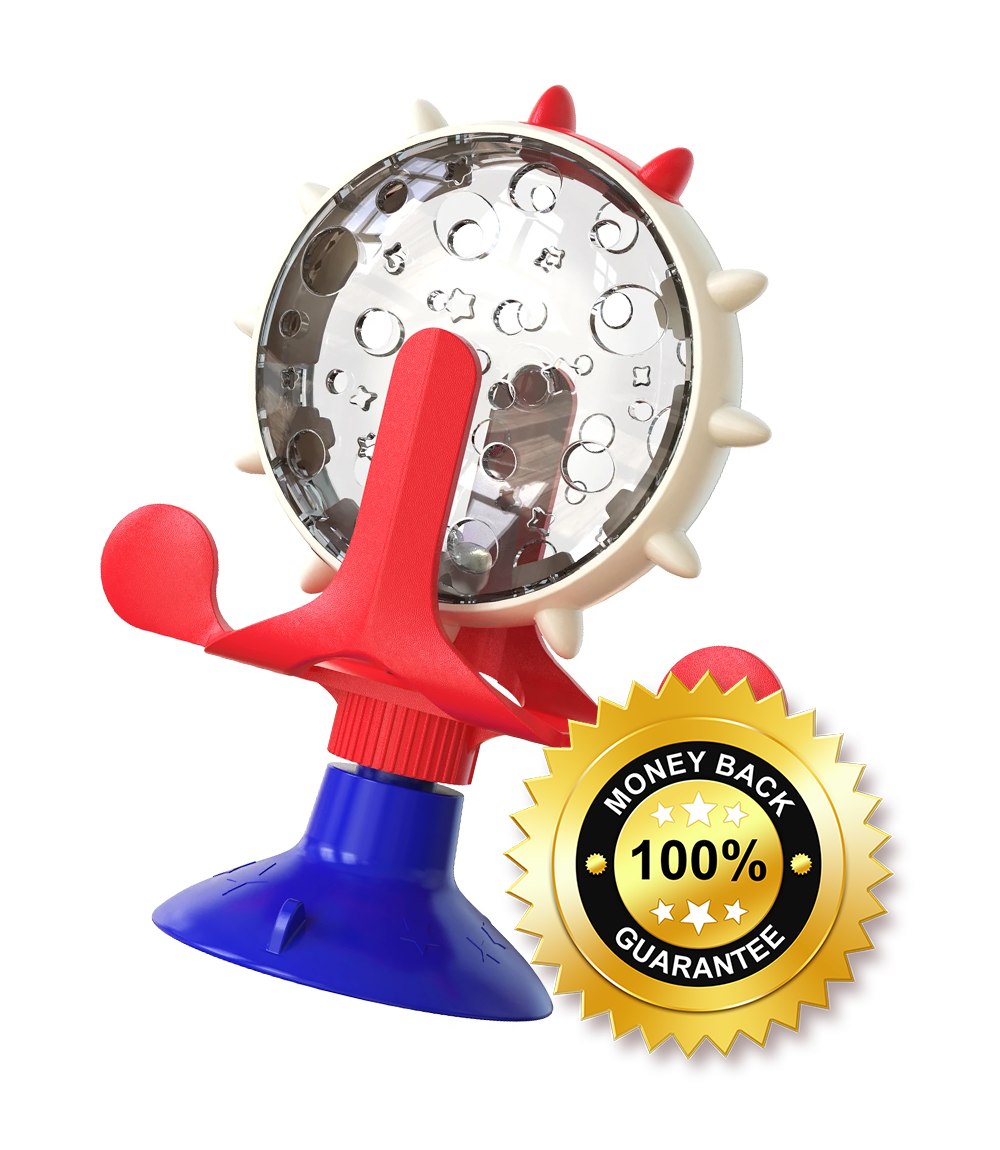 Vul het binnenste compartiment met de favoriete droge brokjes of snacks van je huisdier en bevestig het speeltje met de zuignap op een glad oppervlak. Wanneer je huisdier ertegen duwt of tikt, draait het wiel en vallen er snacks uit via de openingen.